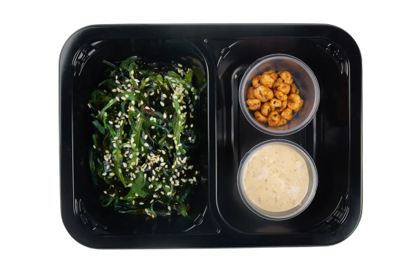 Состав: Морские водоросли Чука, морские водоросли Вакаме, соус ореховый, кунжут жареный, зерна пшеничные воздушные