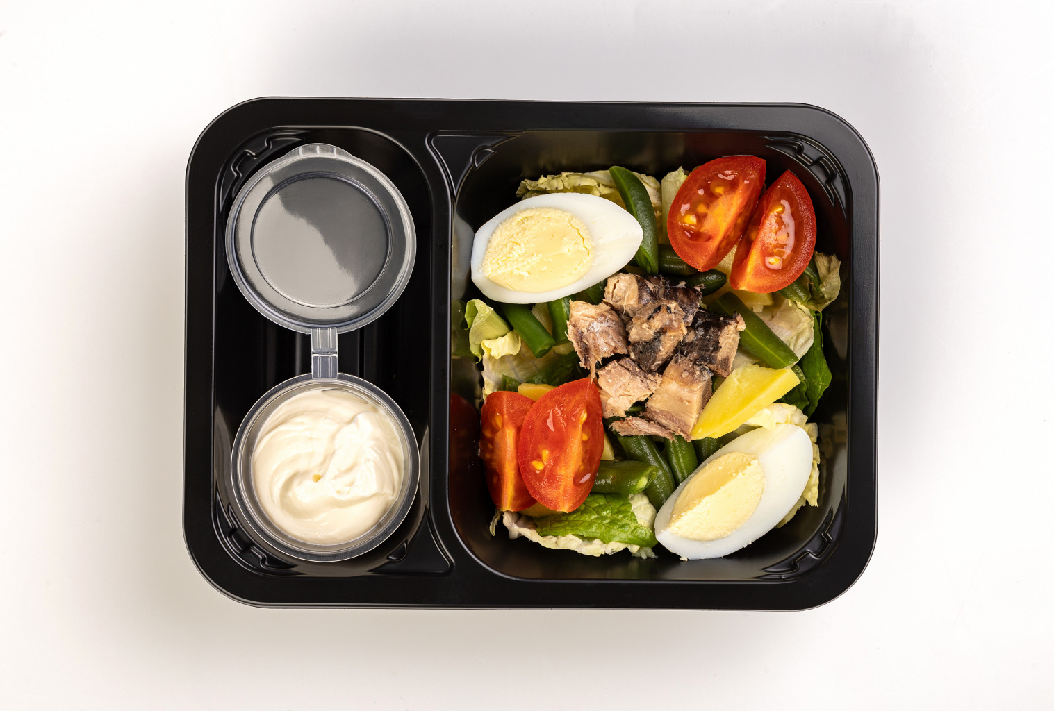 Состав: Лист салата Ромен, Айсберг, капуста пекинская, помидоры черри, фасоль стручковая, яйцо куриное отварное, картофель отварной, тунец консервированный, соус майонез