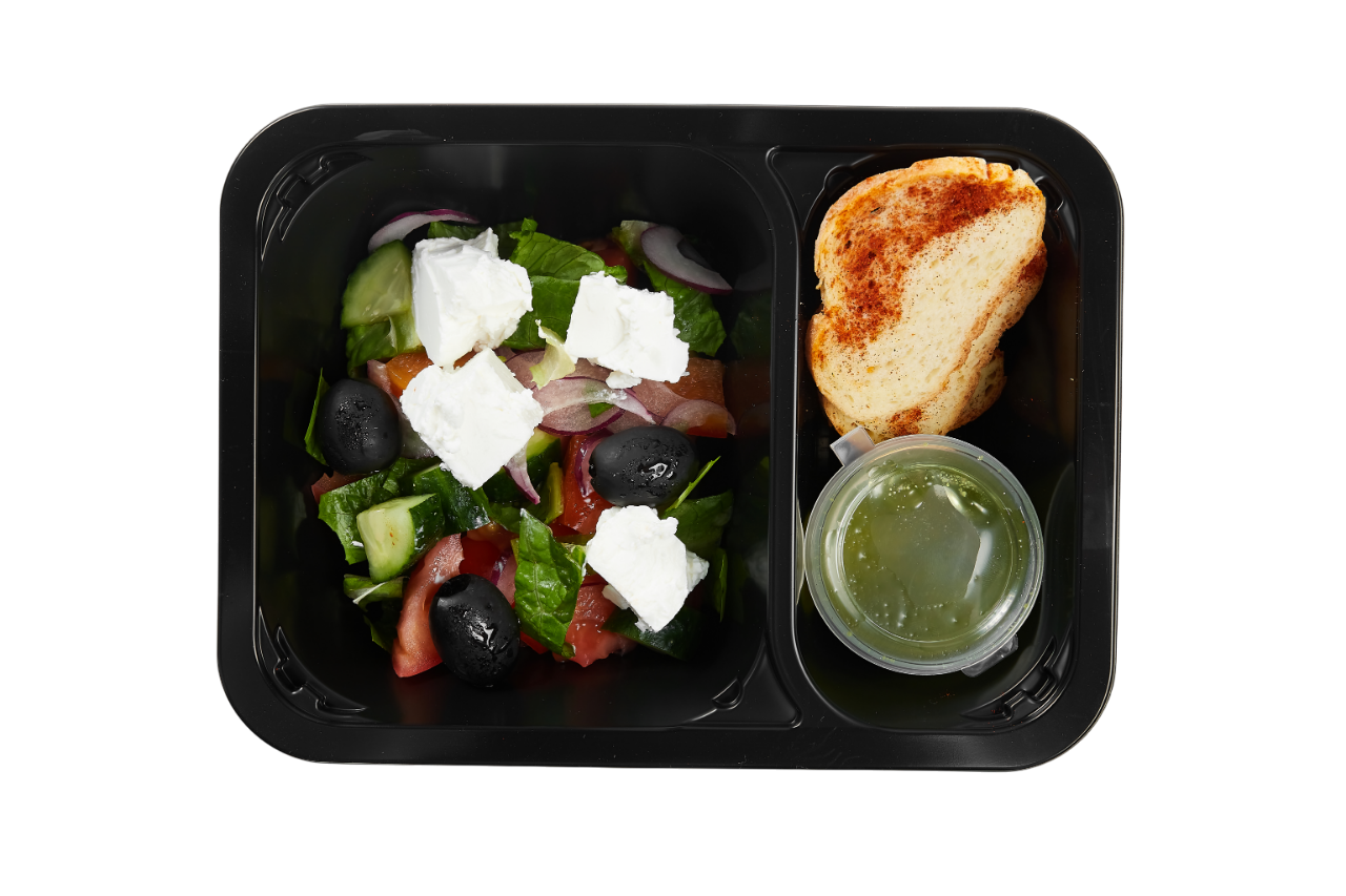 Состав: Помидор свежий, огурец свежий, перец болгарский, маслины, сыр Фета, салат Ромен, масло растительное, петрушка, горчица, сахар, соль, сок лимона, сухарики