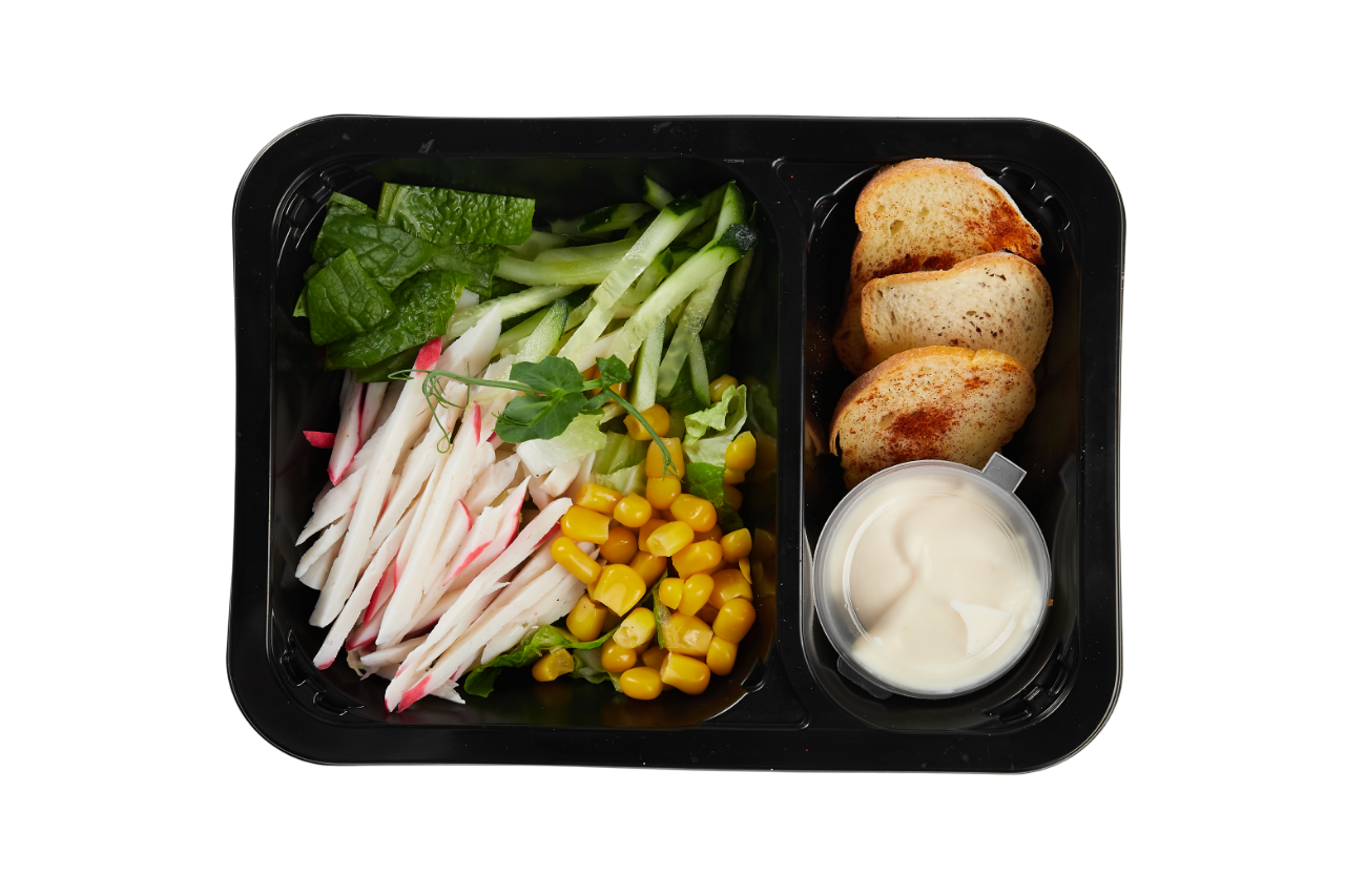 Состав: Крабовые палочки, капуста пекинская, салат Ромен, огурец свежий, кукуруза консервированная, сухари, соль, масло растительное, яйцо, горчица, фреш лимонный, соус соевый, сахар