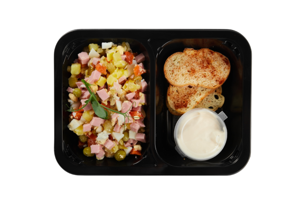 Состав: Колбаса вареная, картофель отварной, морковь отварная, огурец маринованный, яйцо, горошек консервированный, майонез, чеснок, соль, черный молотый перец