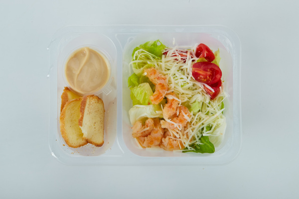 Состав: Креветки, салат Ромен, салат Айсберг, капуста пекинская, сыр Пармезан, помидоры Черри, сухари хлебные, соус Цезарь (масло подсол., соус соевый, соль, сахар, чеснок, яйцо, фреш лимонный).
