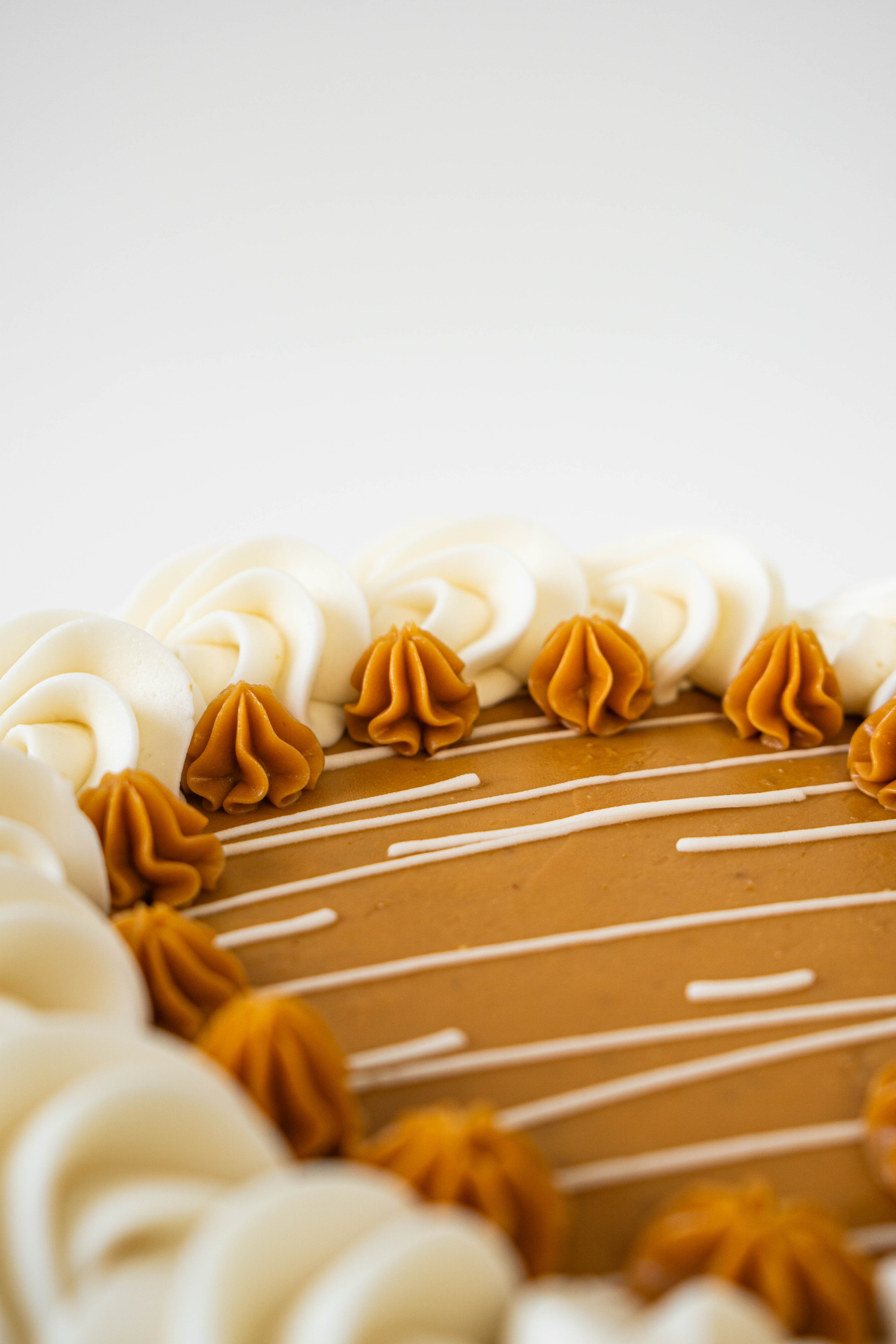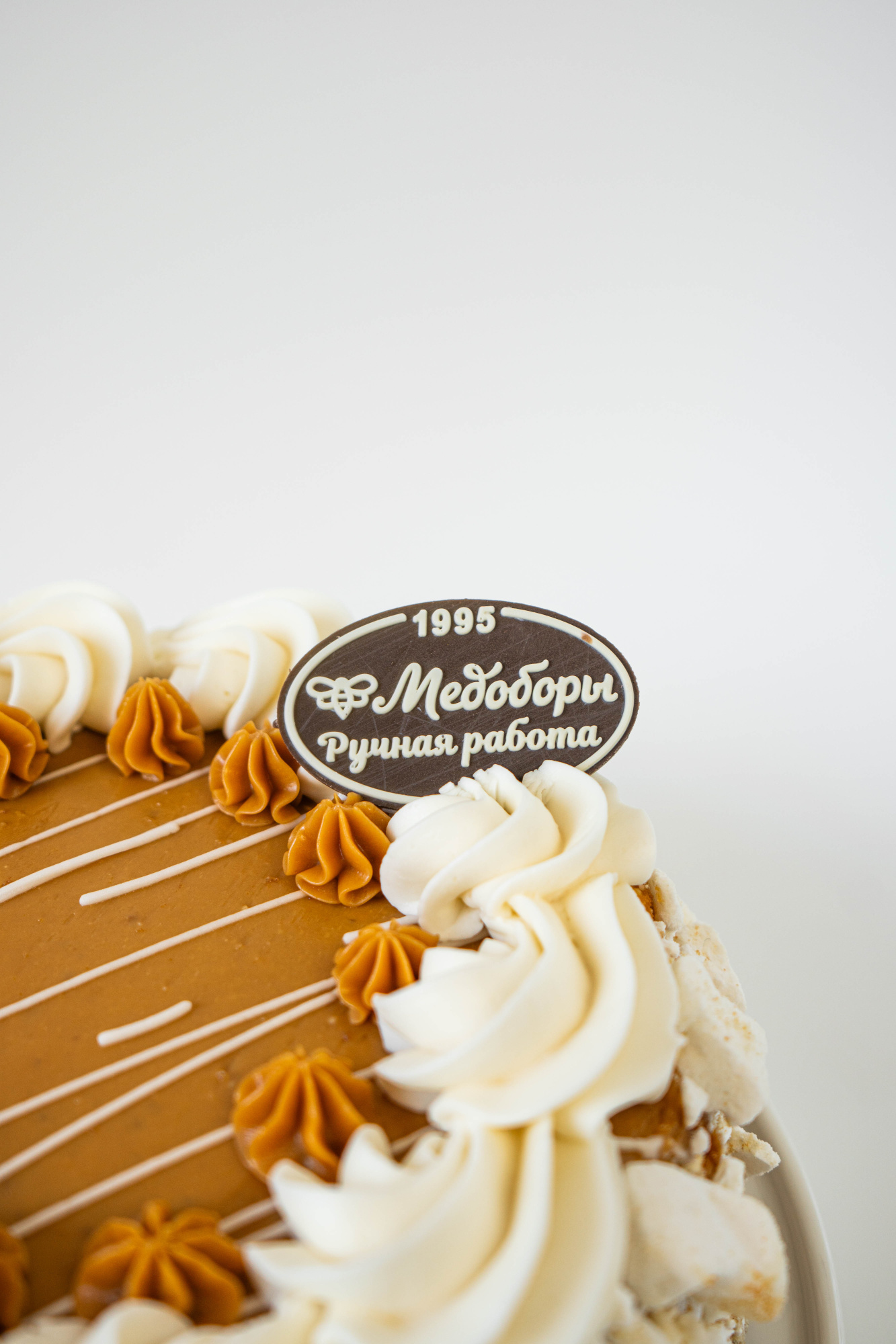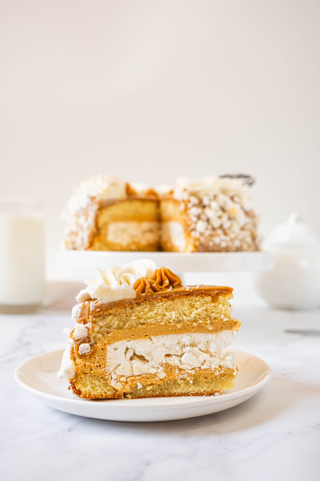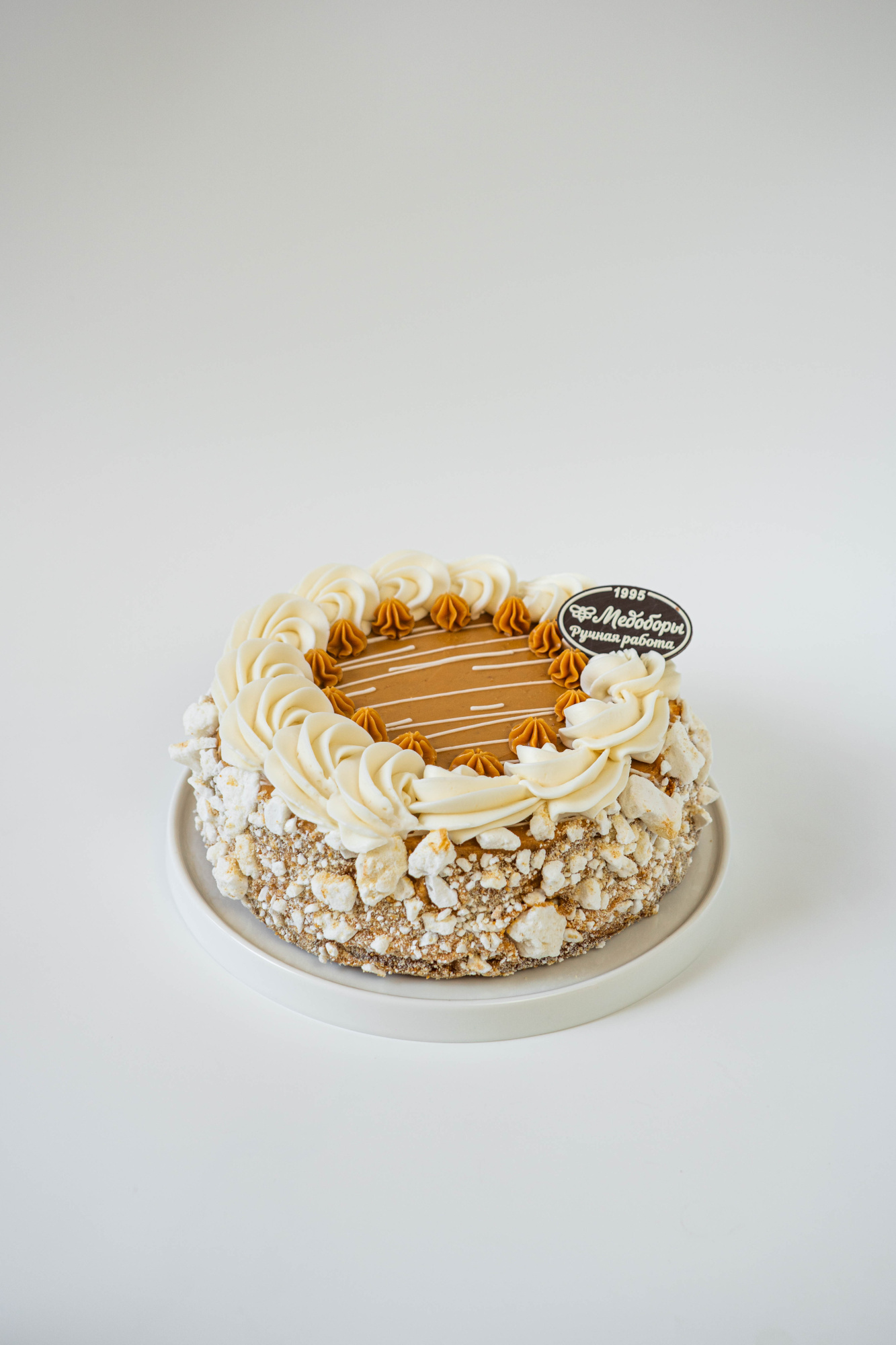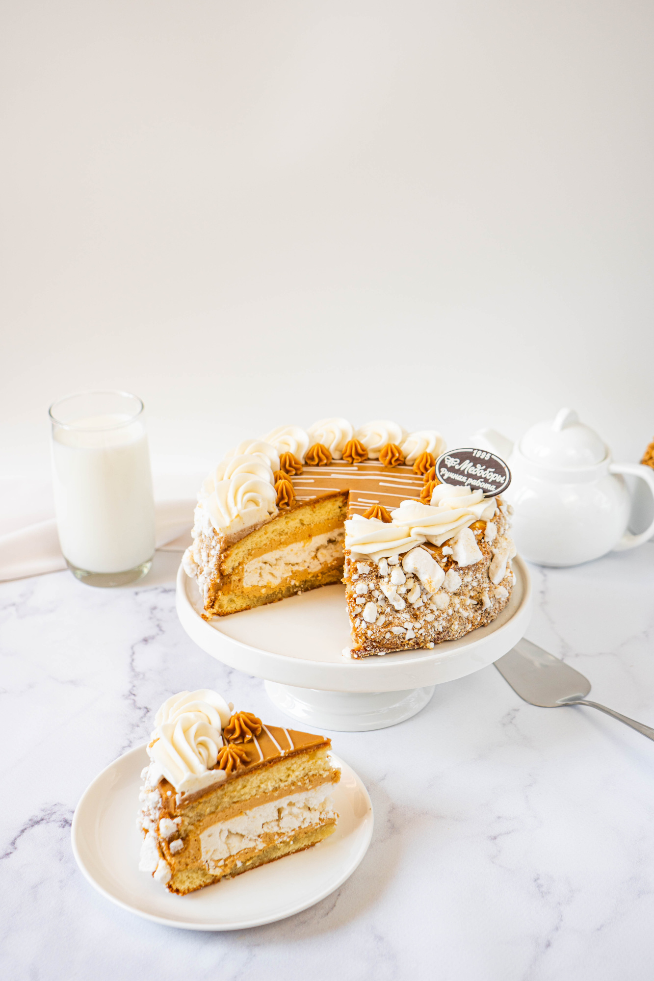 Слои белого бисквита в сочетании с нежным сливочным кремом, кусочками безе и вареной сгущенкой.