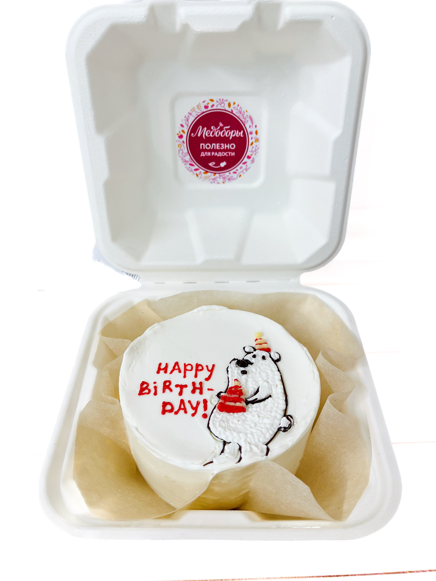 Бенто-торт доступен только при самовывозе. Оформить заказ можно на кассе в любой кондитерской сети "Медоборы"